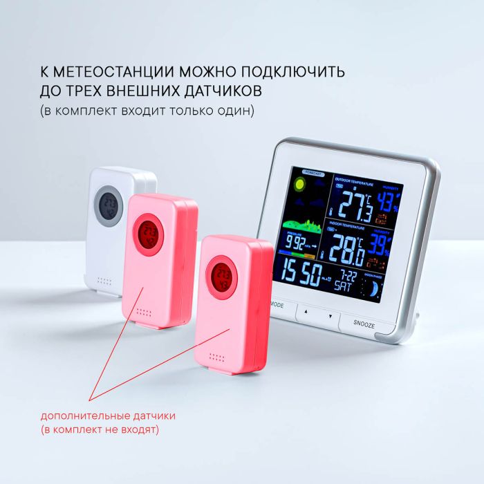 - Функции: время, календарь, погодный прогноз (6 иконок), барометр, фазы Луны, температура/влажность (внутр./наруж.), комфорт-индекс, 2 будильника, звуковое управление.
